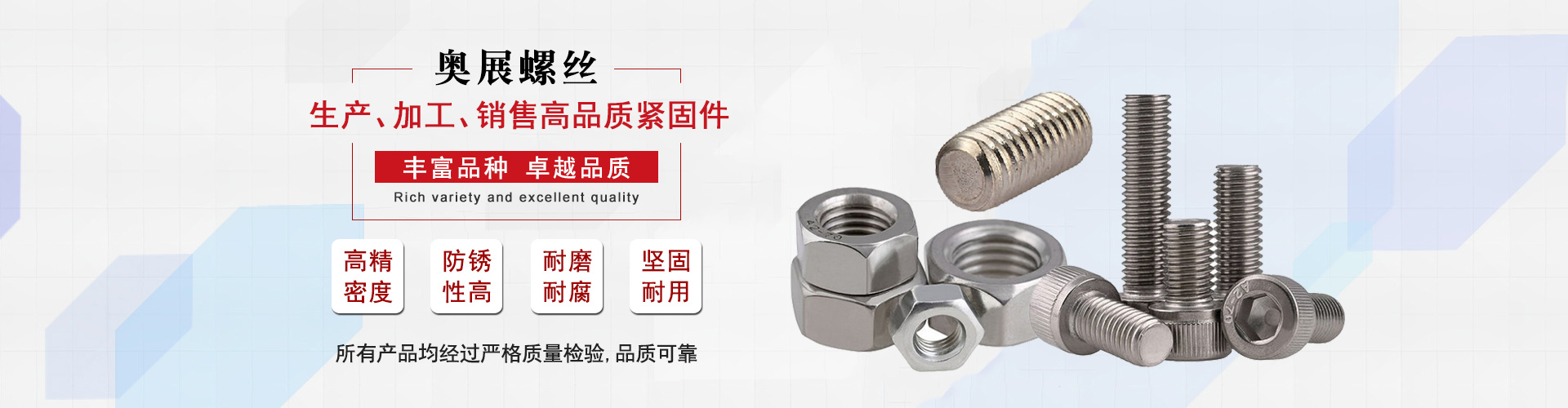 工廠所生產的緊固件均采用國內外優質SUS304,SUS316以及特種合金鋼原材料,產品包括內六角螺絲、外六角螺絲、組合螺絲、膨脹螺絲、六角螺母、尼龍螺母、蓋母、開口銷、墊圈、機螺釘、自攻釘、鉆尾釘、牙條、牙棒及非標準特殊緊固件定制和加工,以及對耐高溫、耐腐蝕、防鎖死、防松、防水、各種顏色等特殊要求的產品,具備強大的配套供應能力。